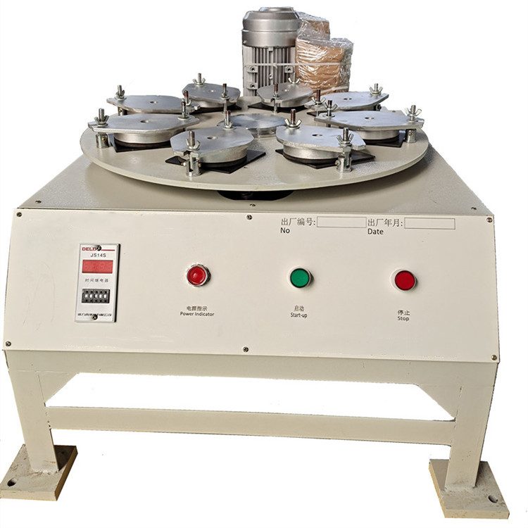 该仪器由机体、传动机构、支承转盘、八个带橡胶密封的金属夹具盒和电控装置组成。电机通过传动机构,支承盘以每分钟300转速运转,随之产生22.5mm的偏心距(e),因此,使每块试样做直径为45mm的圆周运动,从而使磨料在试样釉面上研磨,电控装置将预先设定的转数进行控制,当达到预定转数时,可自动停机。该设备具有结构新颖、运转平稳、噪音低、操作简便,可同时作8个和少于8个样品的试验,由于配置有数显时间继电器,操作者只需接通电源,不需任何监视,它将按照所设定 的时间(转数)自动完成。
